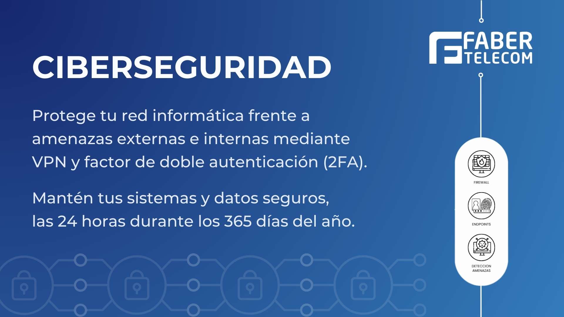 Si alguien accede a tus equipos, ¿cuánto tardarías en detectarlo? ¿Y cuánto te costaría, en tiempo y reputación, recuperar la normalidad? La ciberseguridad para empresas es clave para mantener a salvo datos e información valiosa. De este modo, con el servicio de ciberseguridad de Fabertelecom podrás conocer el estado real de tu seguridad y reforzarla para evitar conflictos el día de mañana.
